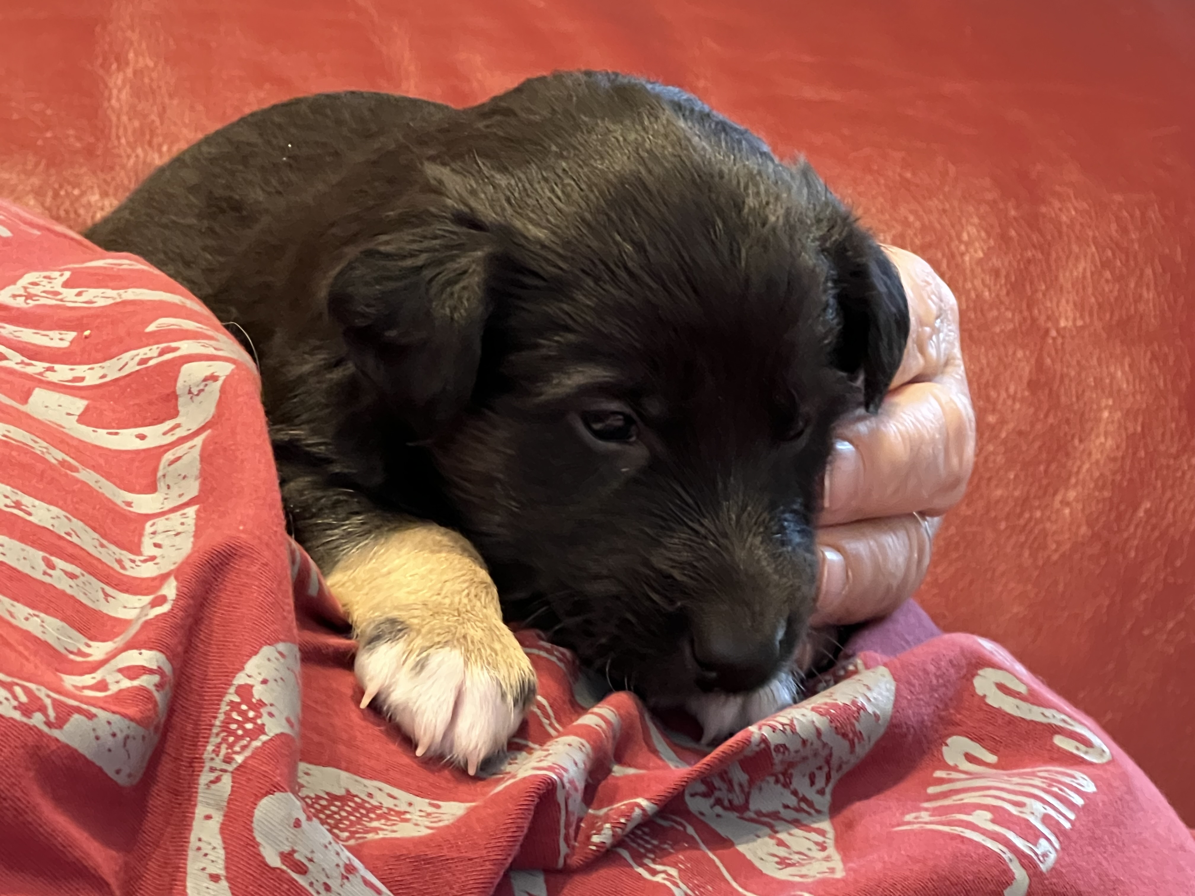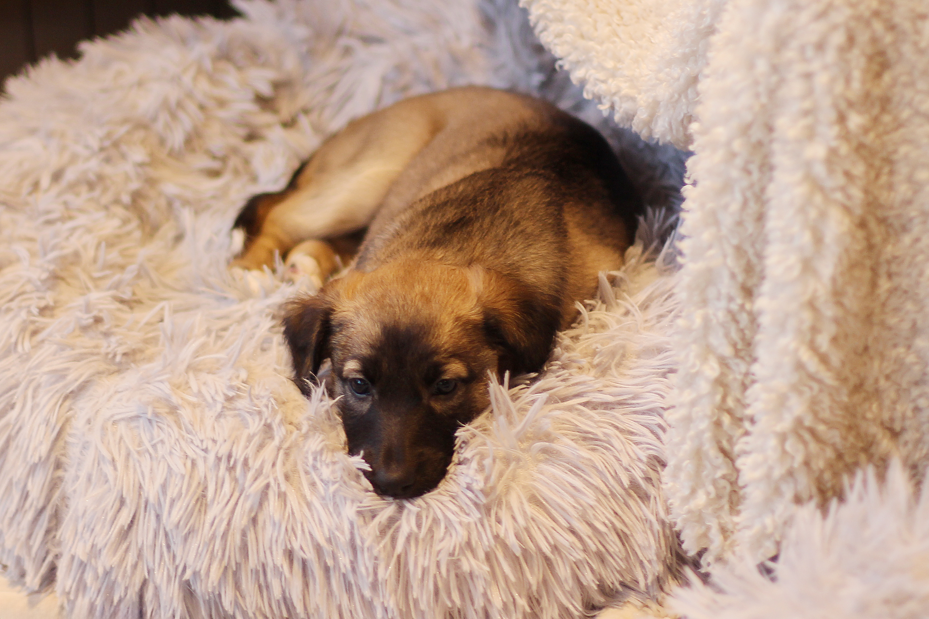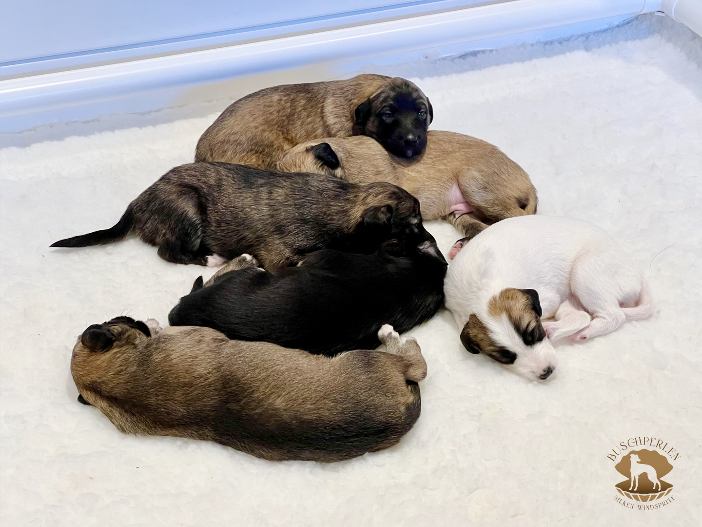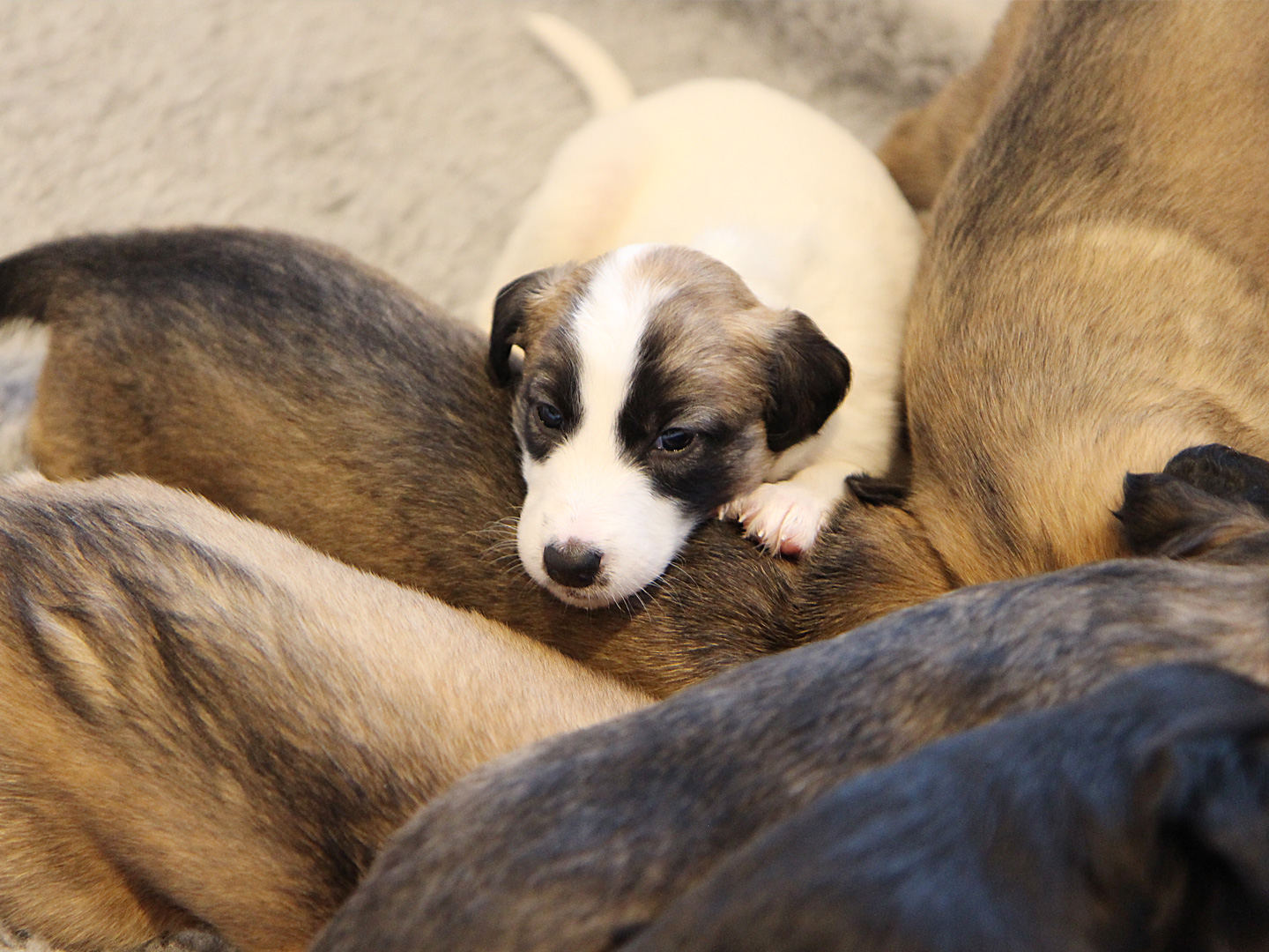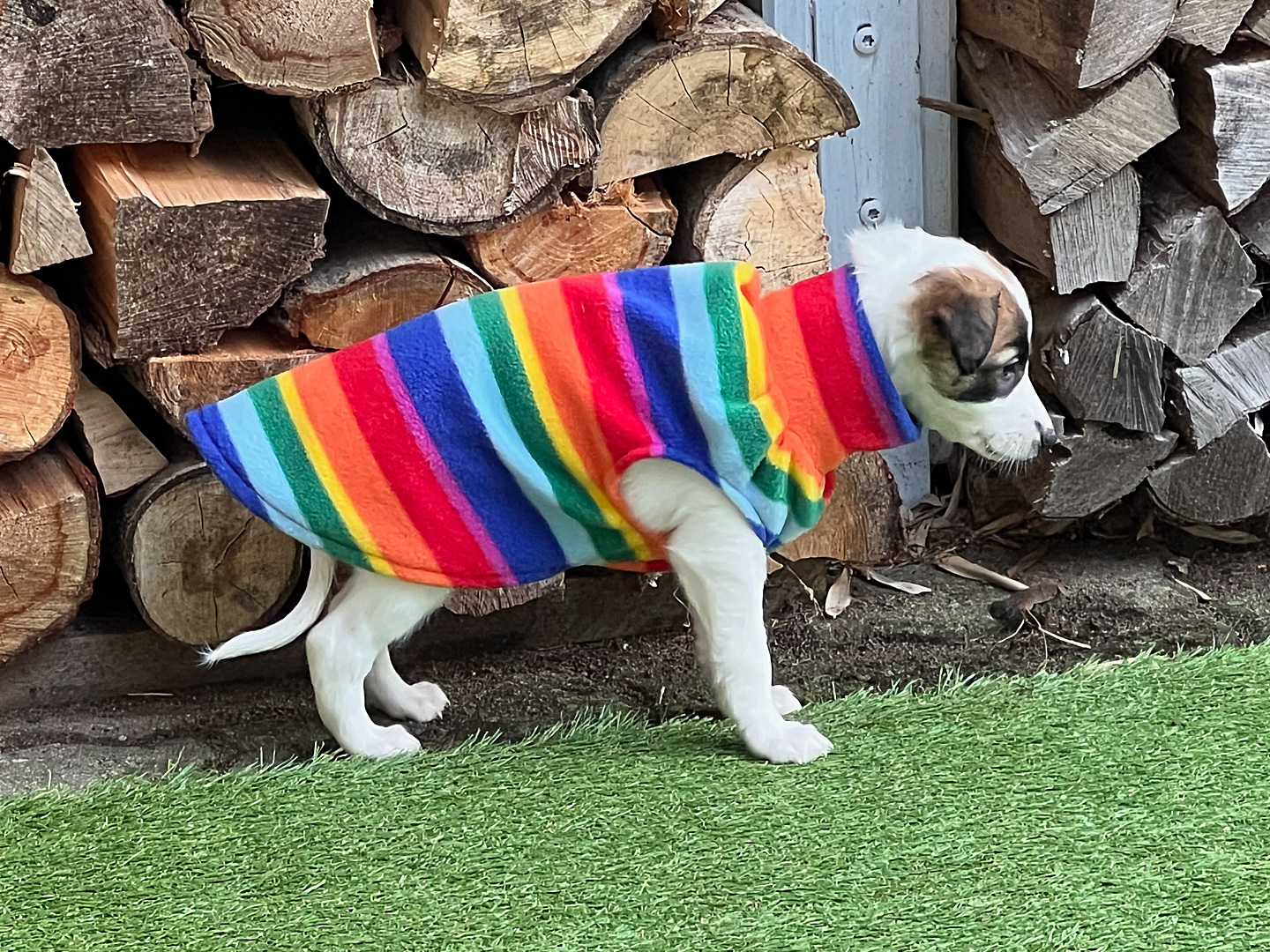 Erste kurze Ausflüge nach draußen sind nun möglich. Leider meint es der Winter in Schleswig-Holstein nicht gut mit uns: es ist kalt und nass, sodass die Welpen schnell frieren. Aber in ihren Mäntelchen trotzen sie dem Wetter und wir unternehmen die ersten Ausflüge und üben Autofahren.