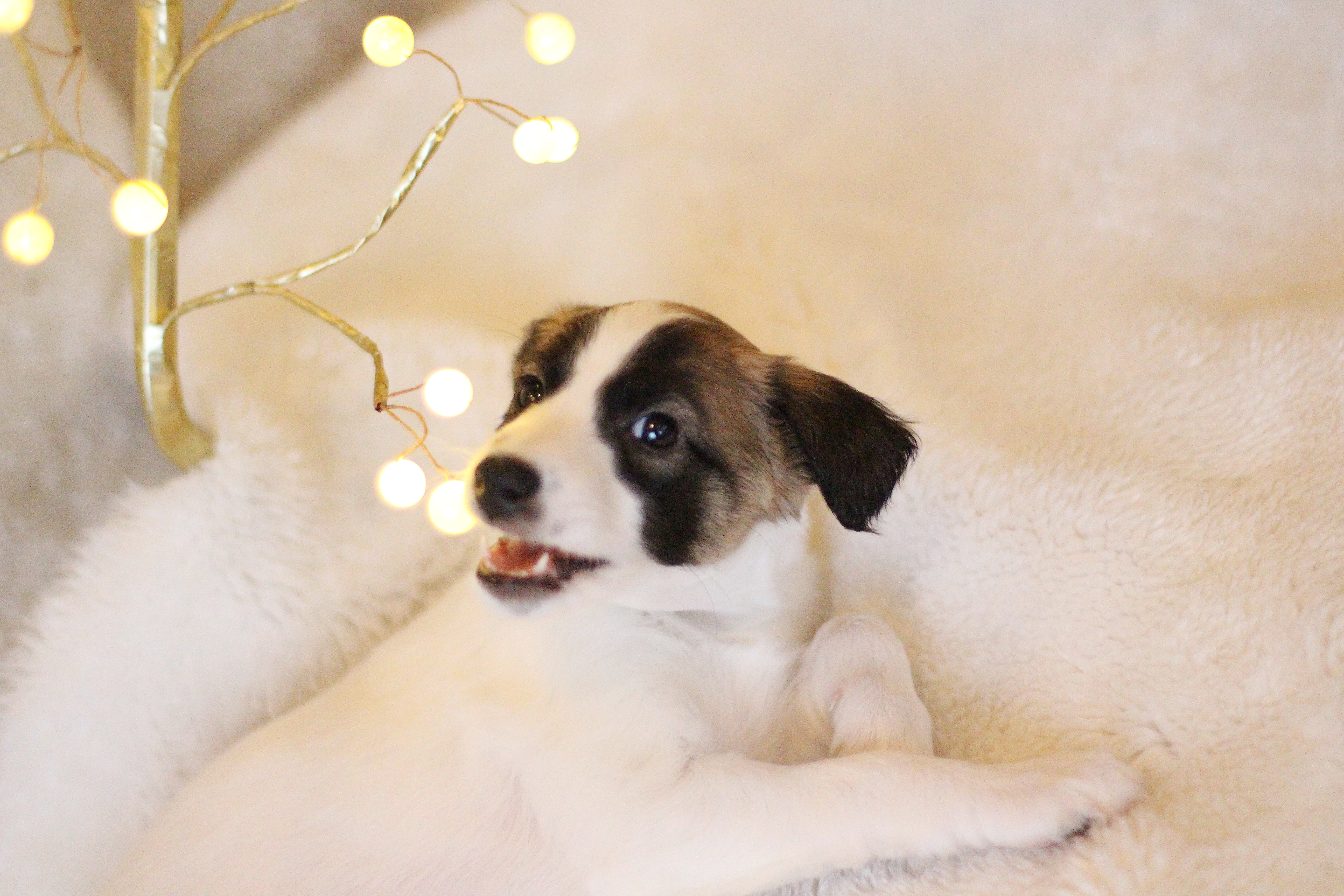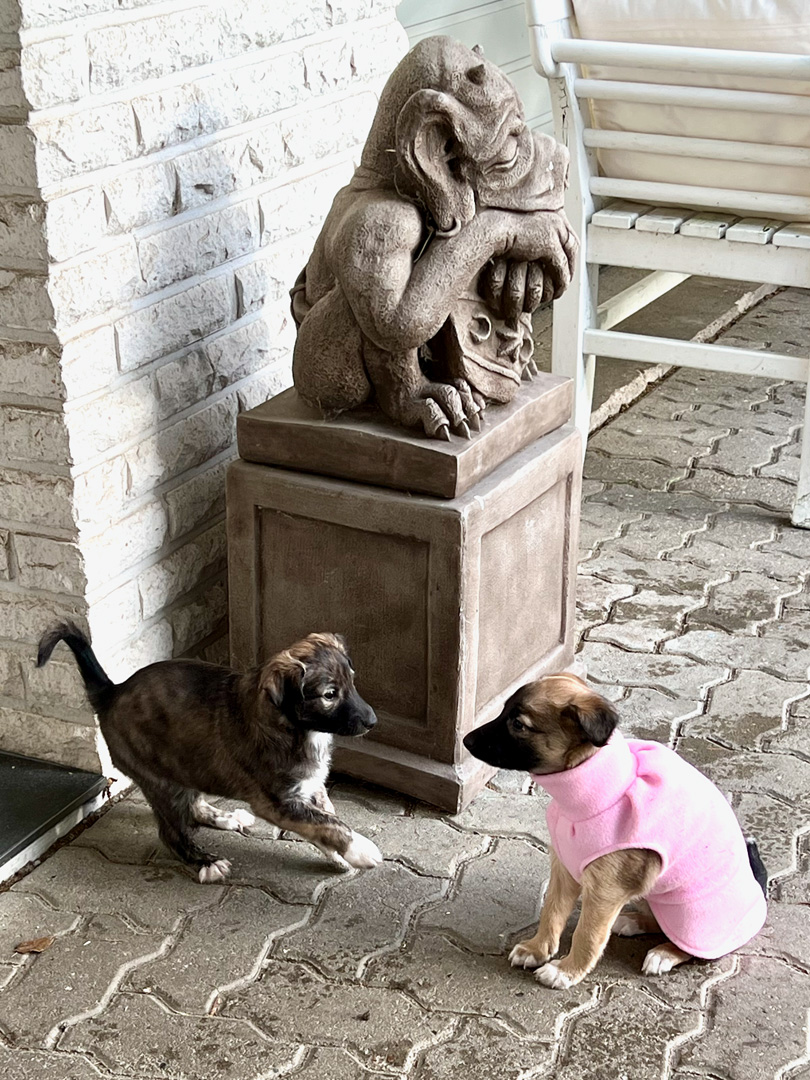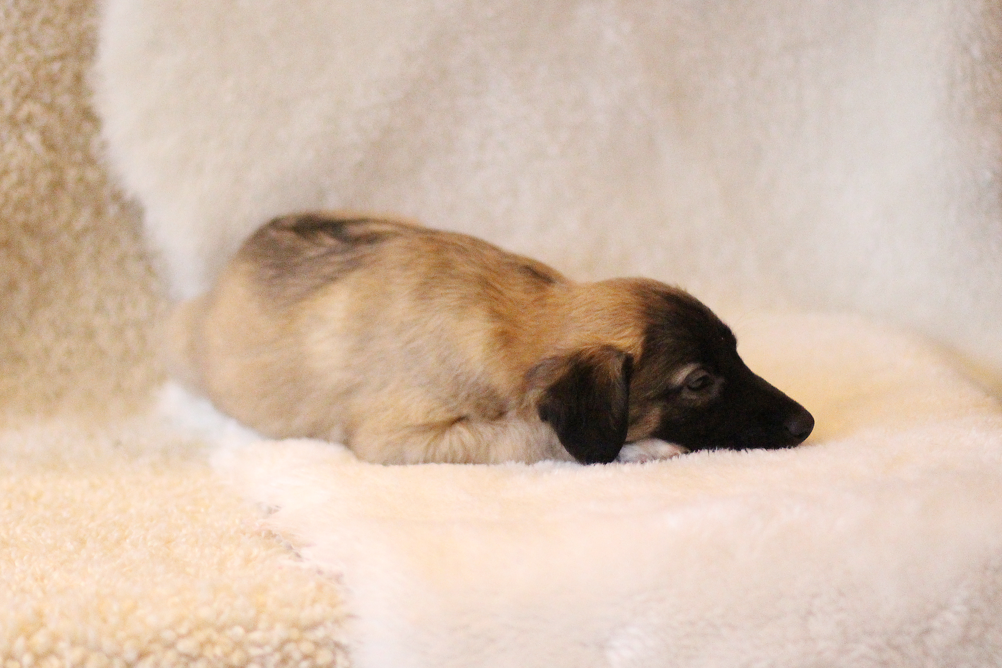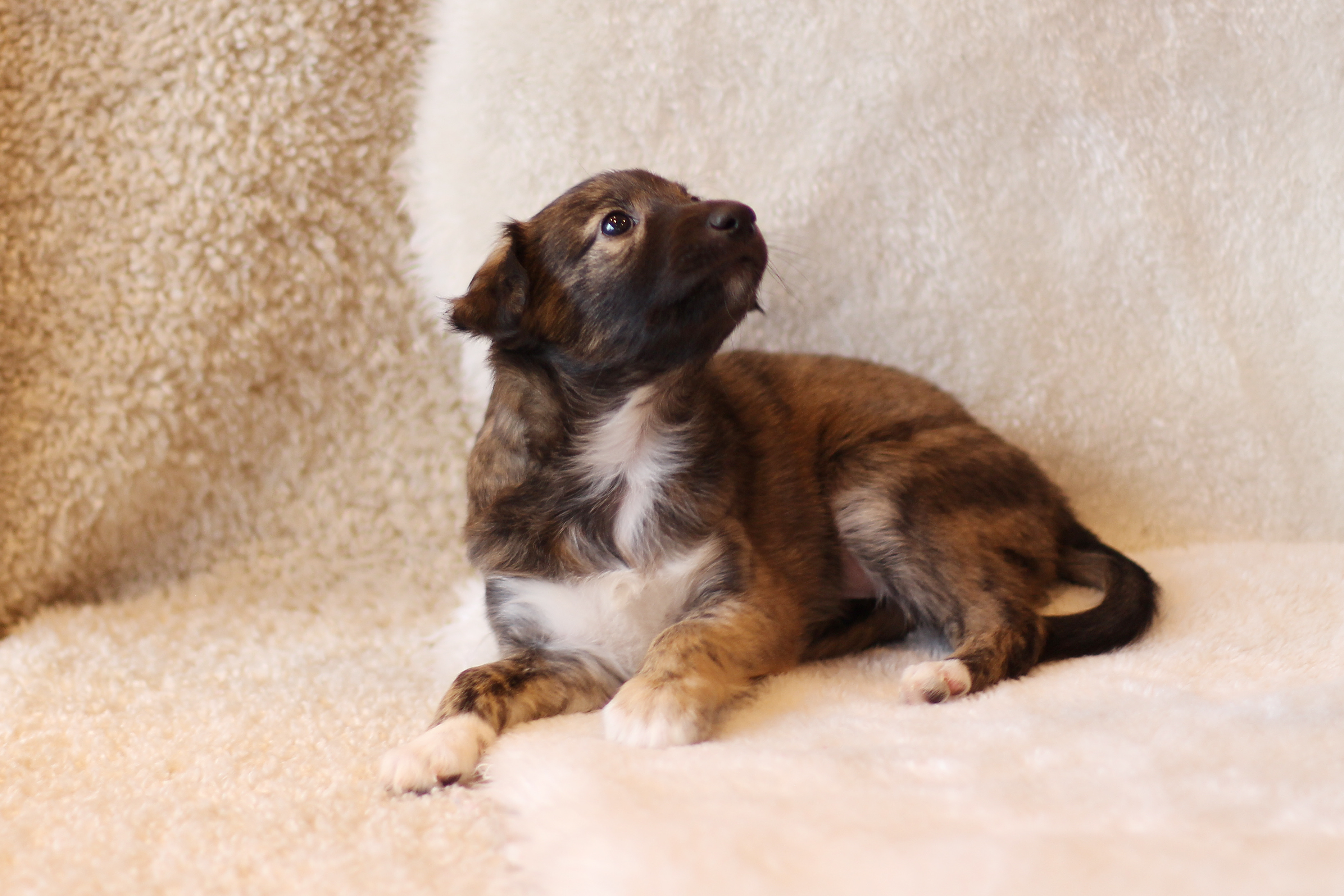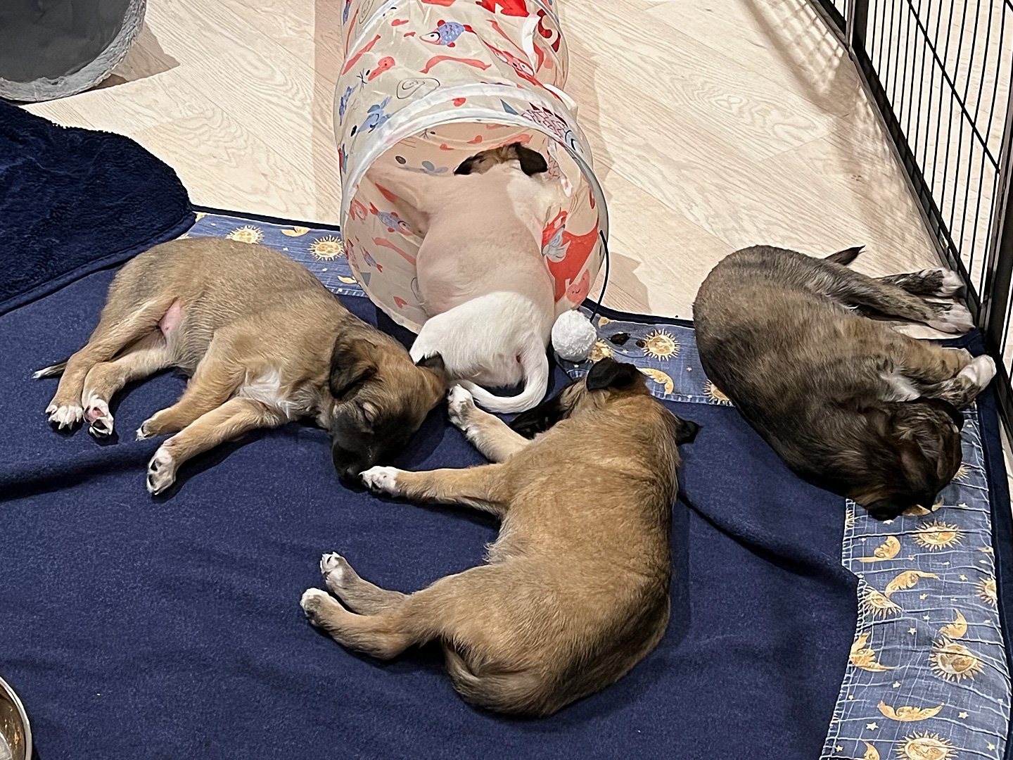 Erste kurze Ausflüge nach draußen sind nun möglich. Leider meint es der Winter in Schleswig-Holstein nicht gut mit uns: es ist kalt und nass, sodass die Welpen schnell frieren. Aber in ihren Mäntelchen trotzen sie dem Wetter und wir unternehmen die ersten Ausflüge und üben Autofahren.