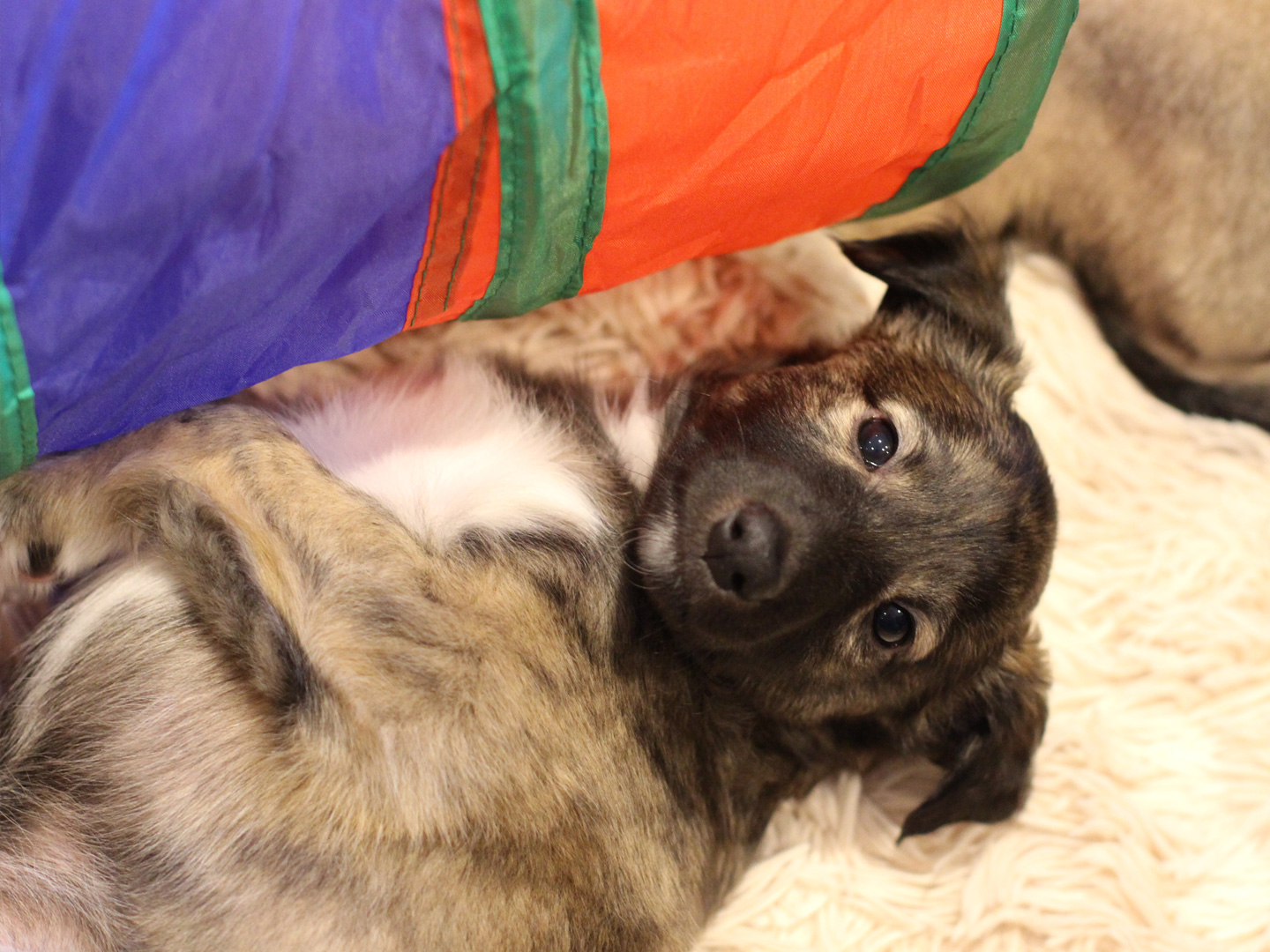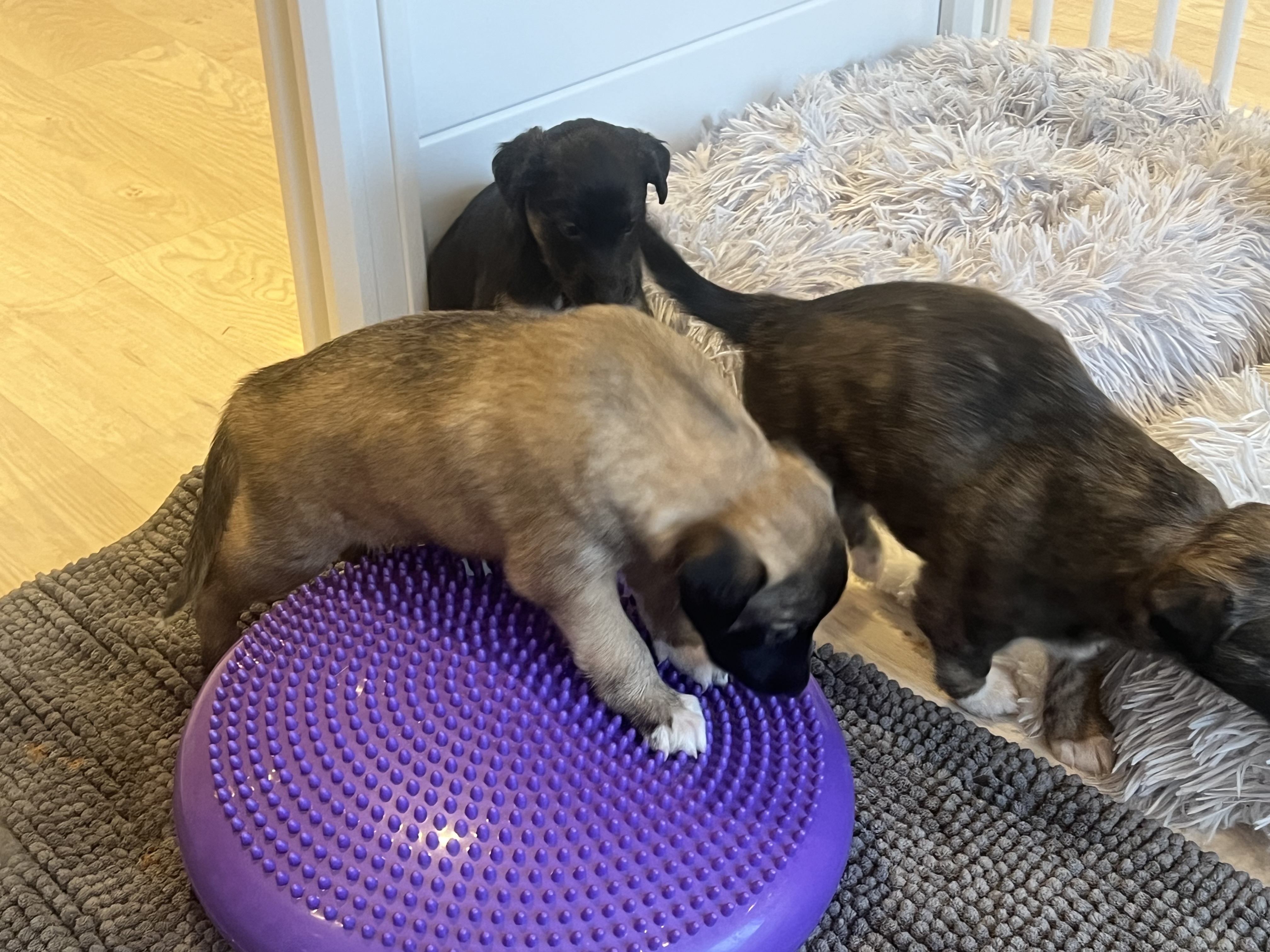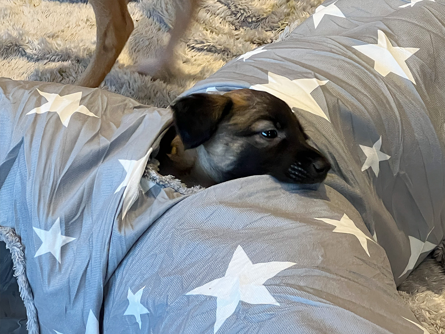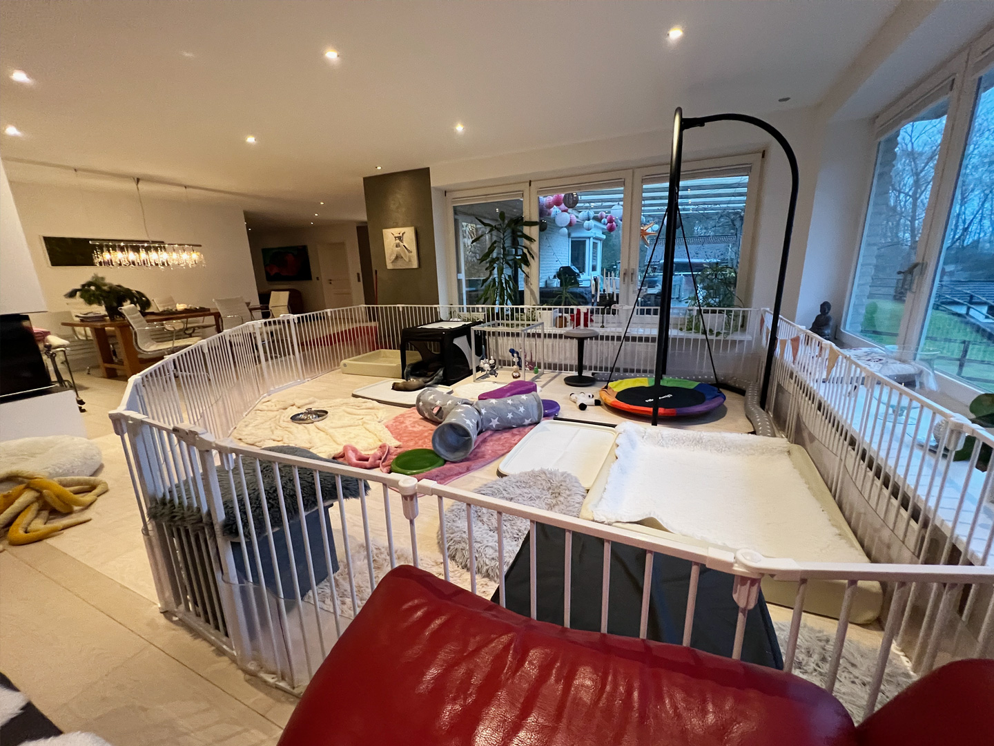 Sie sind nun ins Wohnzimmer umgezogen und erkunden neugierig ihre neue Umgebung. Zum Ende dieser Phase sind sie schon richtig sportlich: es wird auf Balance-Kissen gehoppelt, durch Tunnel gesaust und fleißig geschaukelt.