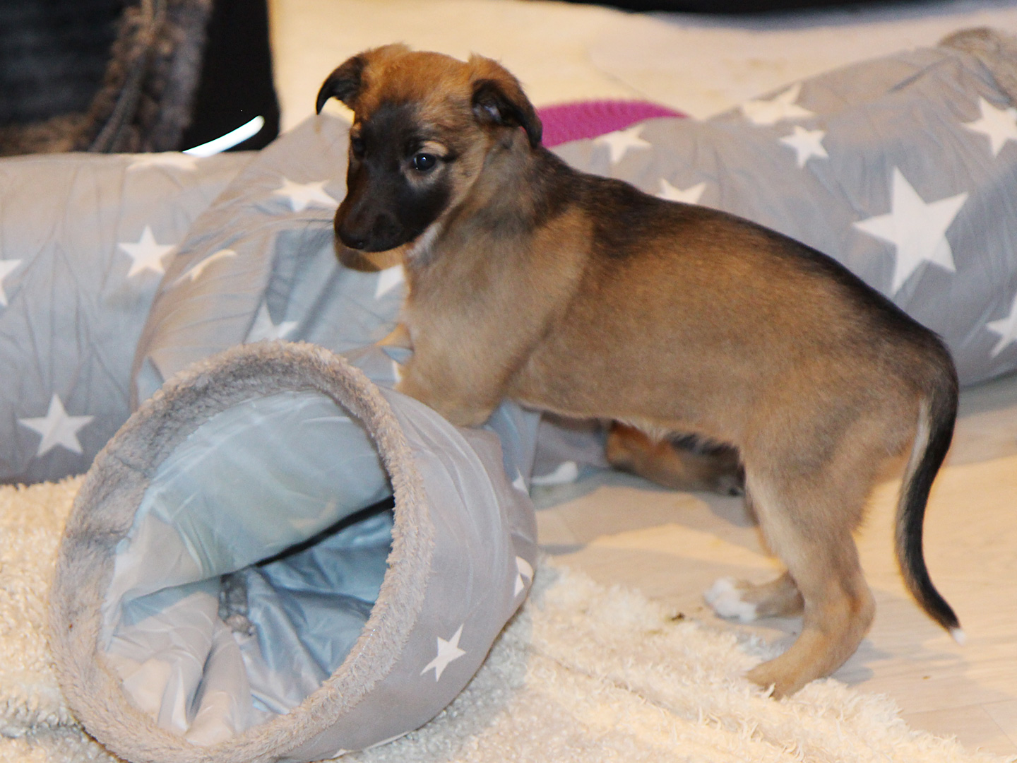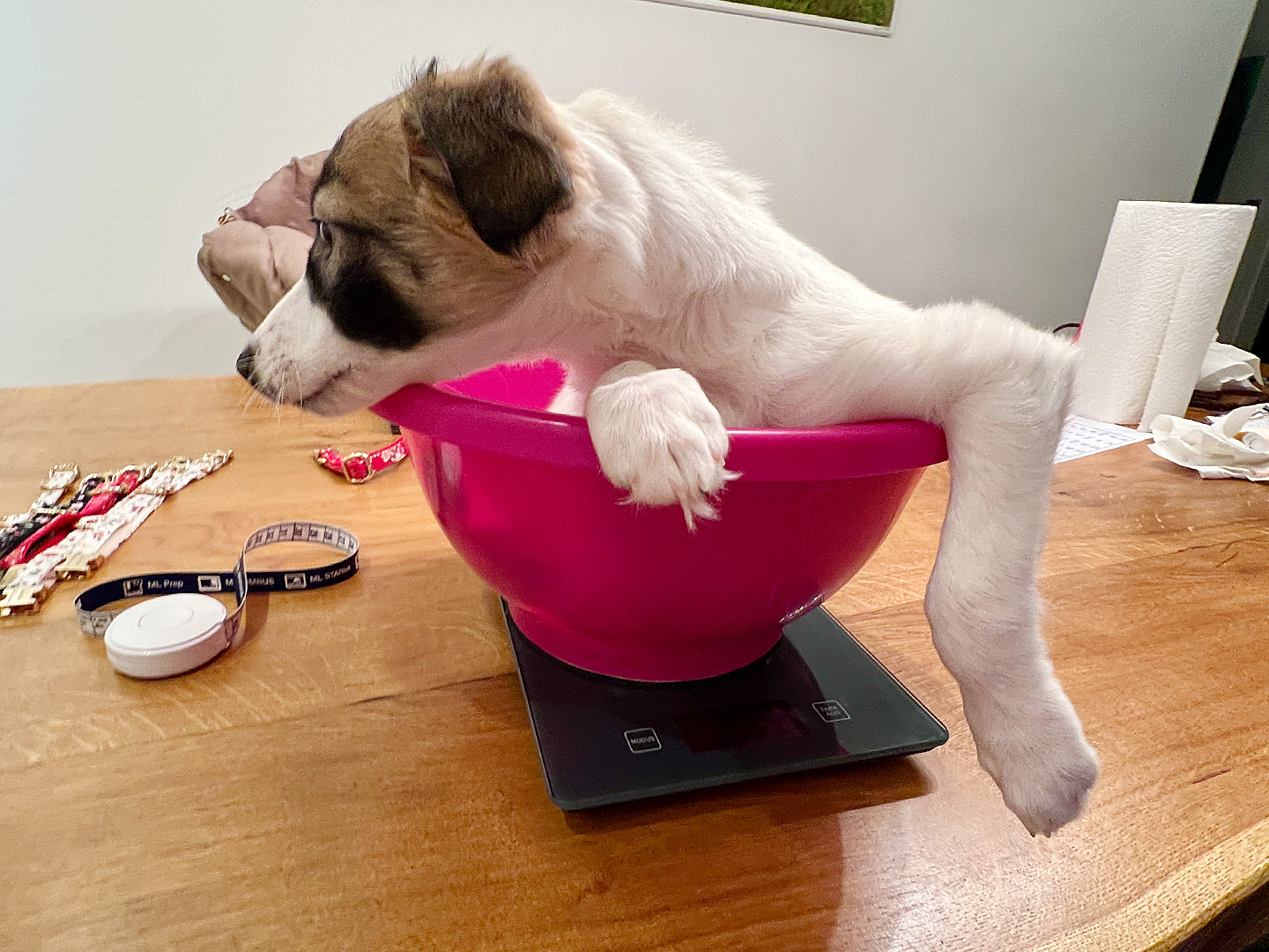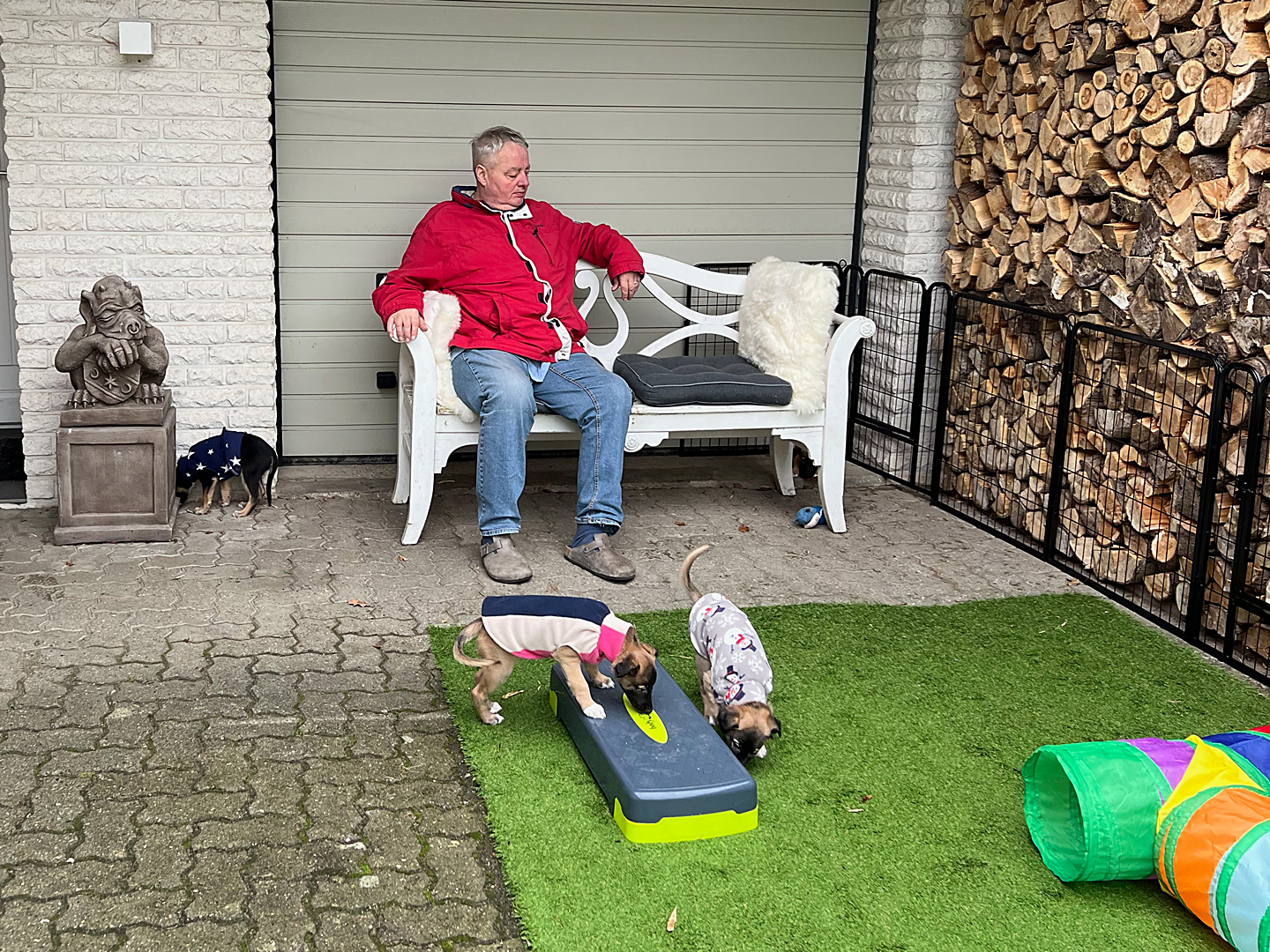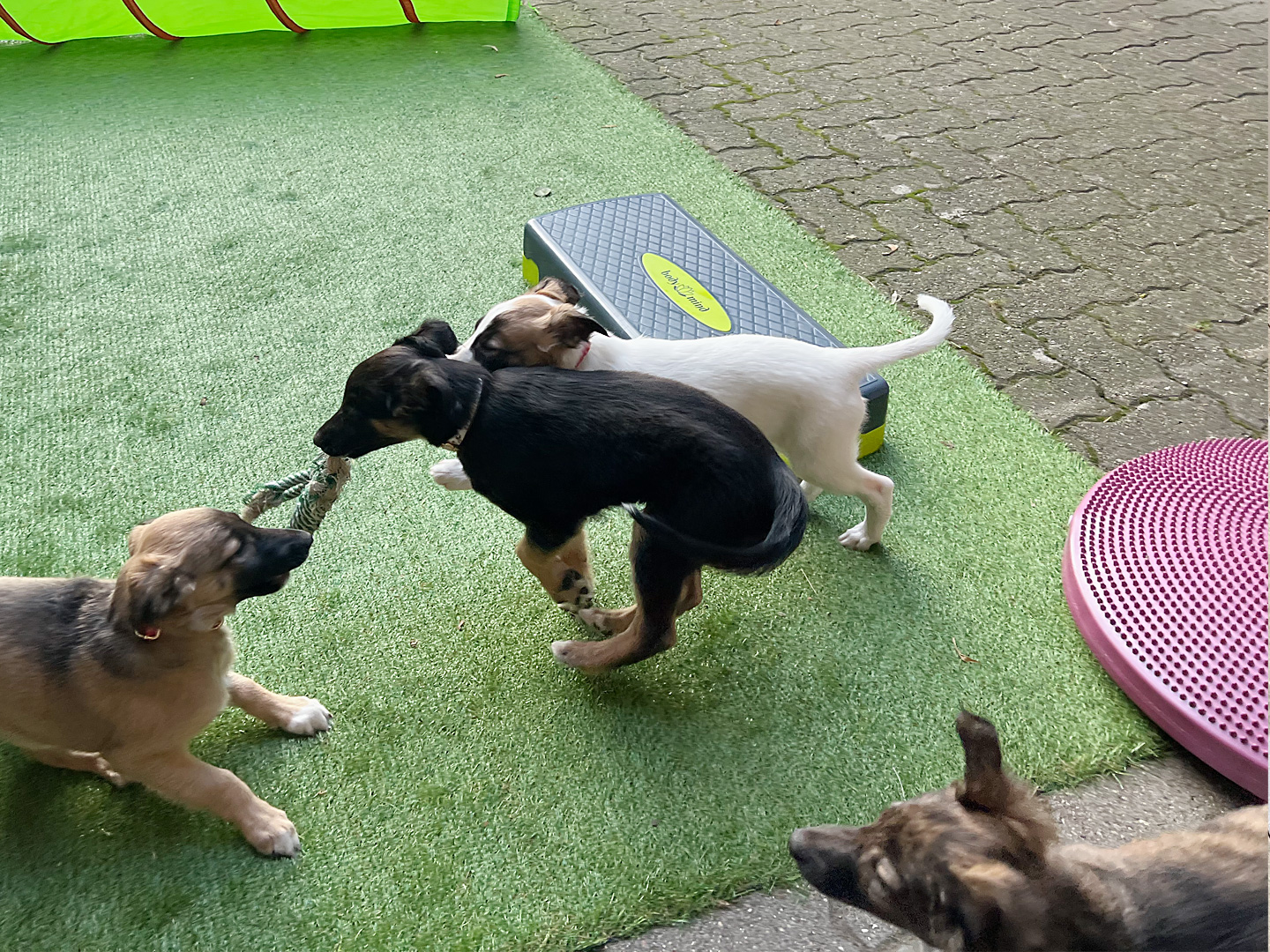 Spätestens ab der siebten Woche hat man das Gefühl eine Horde Hooligans zu beaufsichtigen. Sie zerstören alles, was ihnen zwischen die Zähne kommt und geben im Kampf Geräusche von sich, dass es einem Angst und Bange wird. 😱😉 In dieser ungestümen Wildheit testen sie alles aus: Ihre eigenen Fähigkeiten, ihre Stellung untereinander und überhaupt in der Welt. Eine aufreibende, aber wirklich spannende Zeit. Wir unternehmen mehr Ausflüge und gewöhnen die Welpen an verschiedene Umgebungen und Geräusche. Sozialisierung mit vielen verschiedenen Menschen ist immer noch ein täglicher Bestandteil.