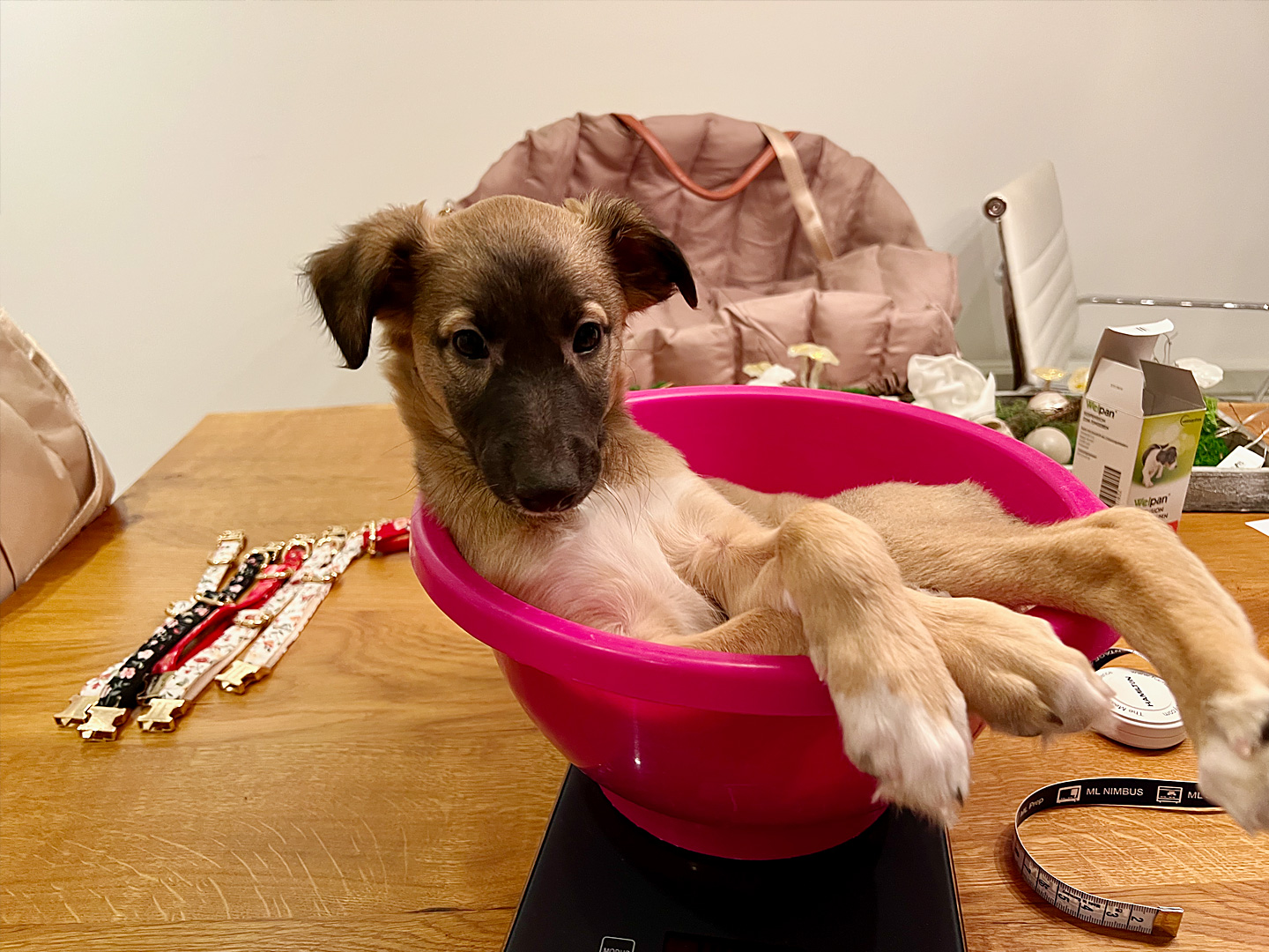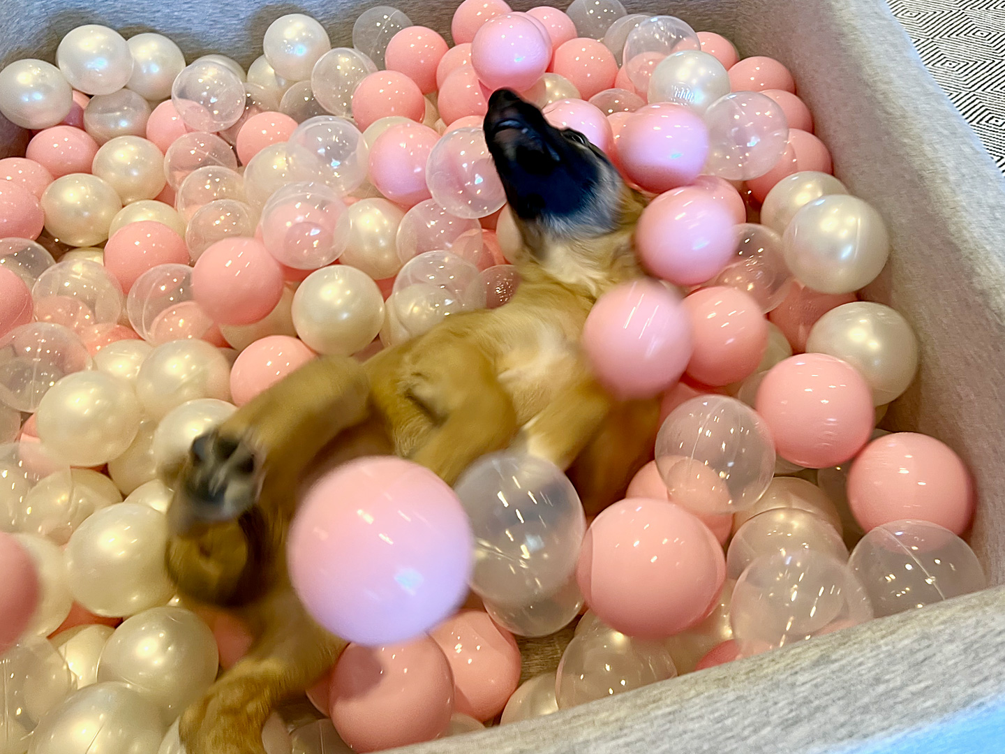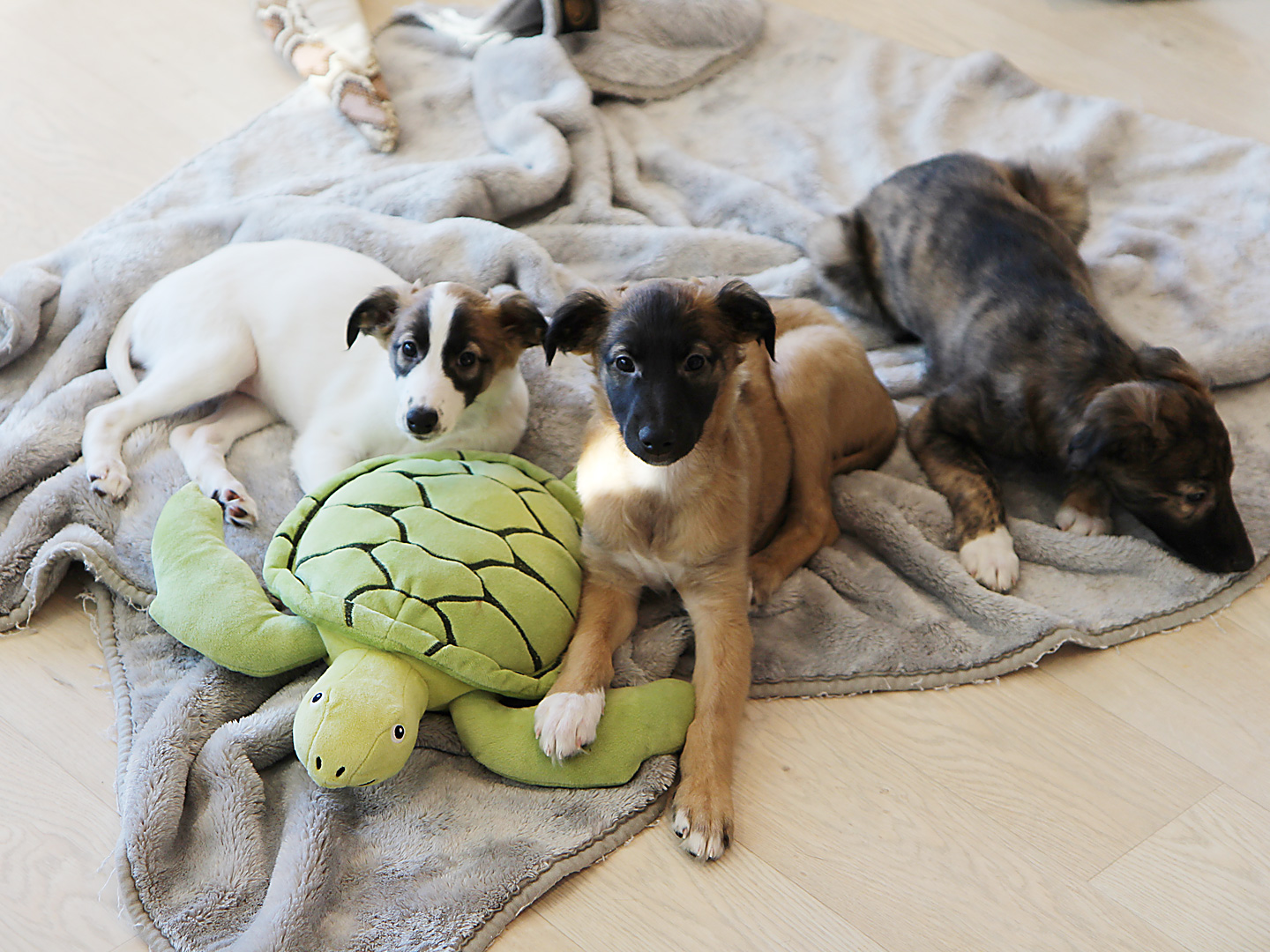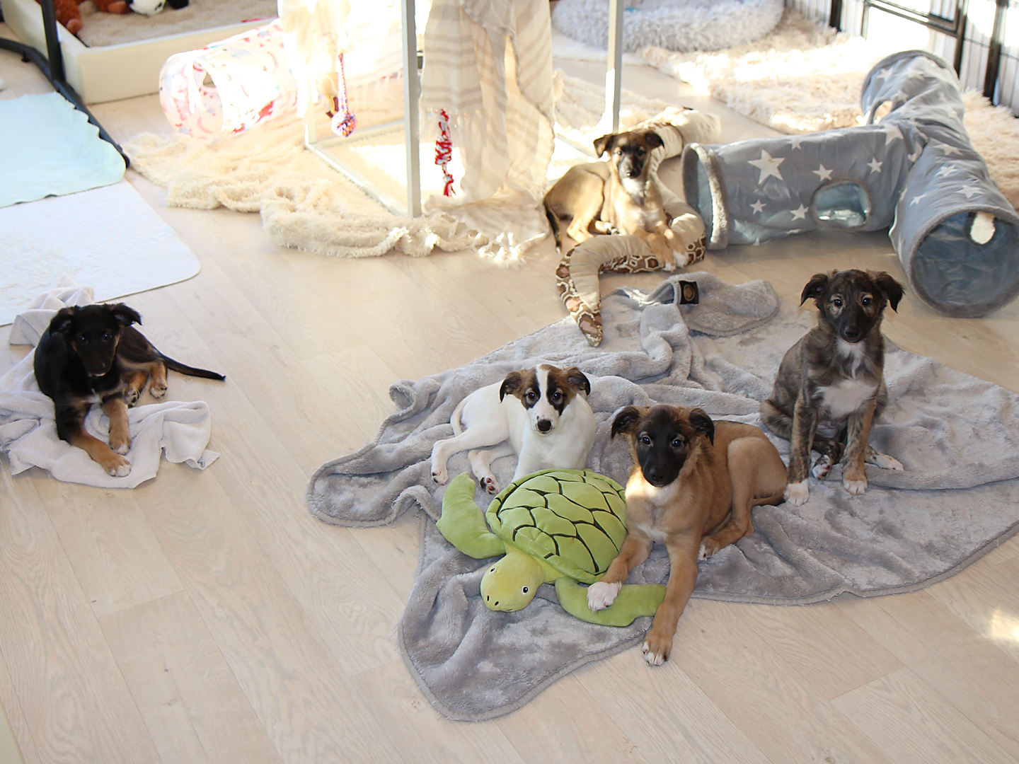 Spätestens ab der siebten Woche hat man das Gefühl eine Horde Hooligans zu beaufsichtigen. Sie zerstören alles, was ihnen zwischen die Zähne kommt und geben im Kampf Geräusche von sich, dass es einem Angst und Bange wird. 😱😉 In dieser ungestümen Wildheit testen sie alles aus: Ihre eigenen Fähigkeiten, ihre Stellung untereinander und überhaupt in der Welt. Eine aufreibende, aber wirklich spannende Zeit. Wir unternehmen mehr Ausflüge und gewöhnen die Welpen an verschiedene Umgebungen und Geräusche. Sozialisierung mit vielen verschiedenen Menschen ist immer noch ein täglicher Bestandteil.