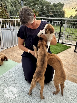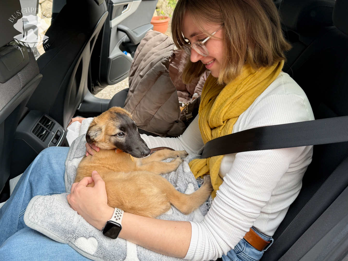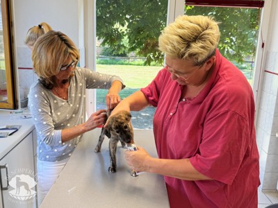 Wir unternehmen in den letzten 3 Wochen regelmäßig Ausflüge und gewöhnen die Welpen an verschiedene Umgebungen und Geräusche. Die Sozialisierung mit vielen verschiedenen Menschen ist immer noch ein regelmäßiger Bestandteil. In der achten Woche besuchen wir die Tierärtzpraxis und die Welpen werden geimpft und gechippt. Mit leckerer Bestechung finden sie das alle überhaupt nicht schlimm.