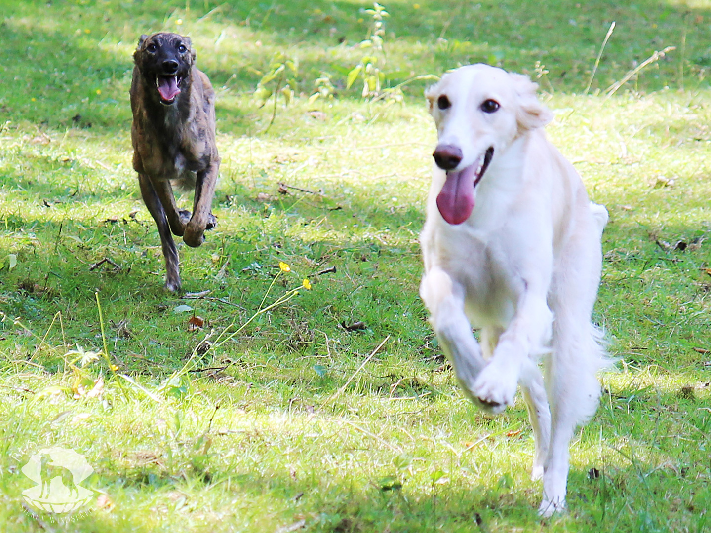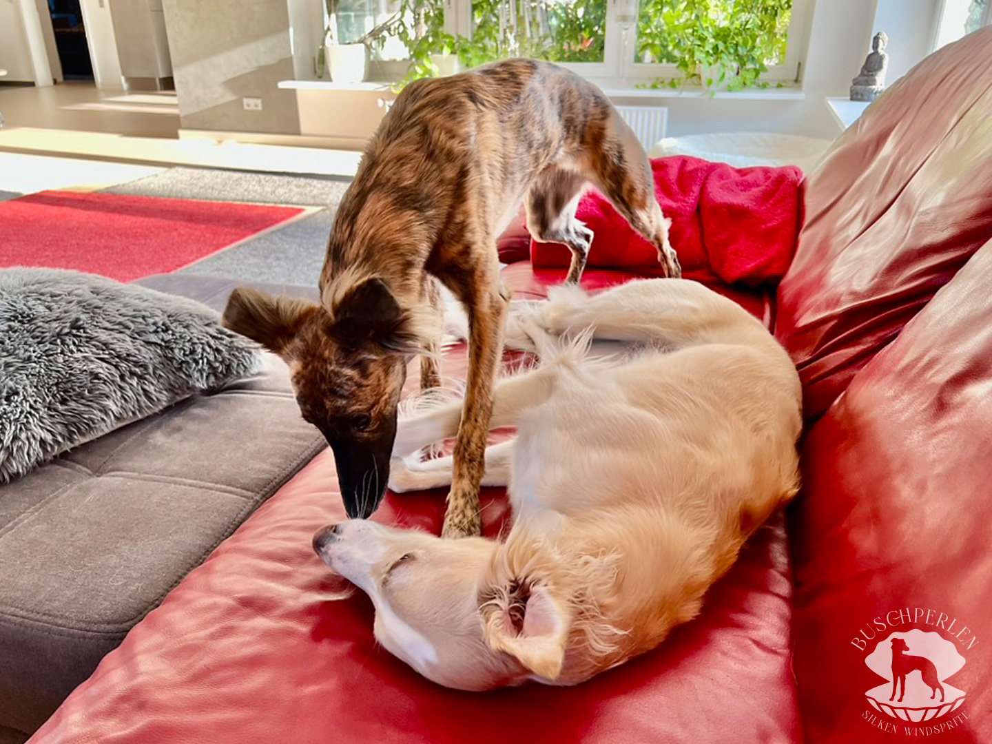 Wir erhoffen uns von dieser Verpaarung von zwei F3 Windsprites eine Erhöhung der genetischen Diversität mit den damit verbundenen positiven Auswirkungen auf die langfristige Gesundheit der Rasse. Apropos Gesundheit: Jeannie und Mio sind bereits 3,5 und 5,5 Jahre alt. Bis zur Zulassung der F3 Silken Windsprites hat es ja bekanntlich einige Jahre gedauert. Positiv daran ist, dass wir wissen, dass beide Hunde eine phantastische Konstitution und Gesundheit haben. Beide sind körperlich total fit und wirklich robust und unempfindlich – eigentlich waren sie noch nie richtig krank und vertragen jedes Futter.