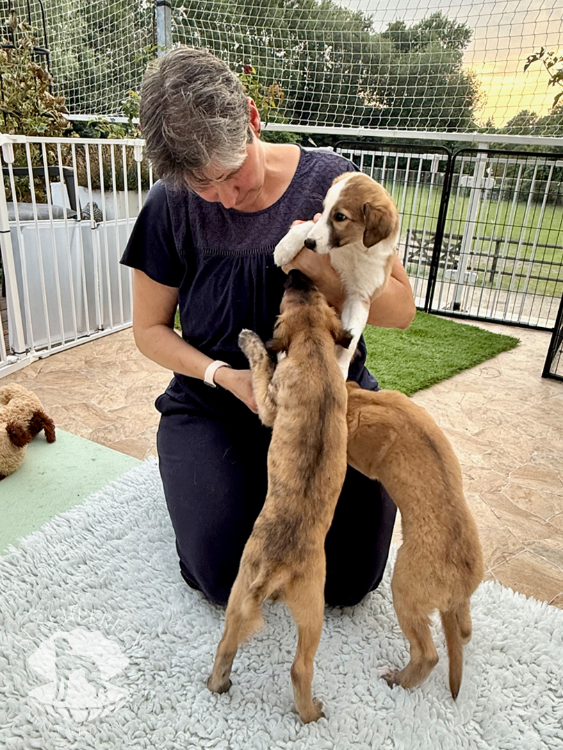Wir unternehmen in den letzten 3 Wochen regelmäßig Ausflüge und gewöhnen die Welpen an verschiedene Umgebungen und Geräusche. Die Sozialisierung mit vielen verschiedenen Menschen ist immer noch ein regelmäßiger Bestandteil. In der achten Woche besuchen wir die Tierärtzpraxis und die Welpen werden geimpft und gechippt. Mit leckerer Bestechung finden sie das alle überhaupt nicht schlimm.