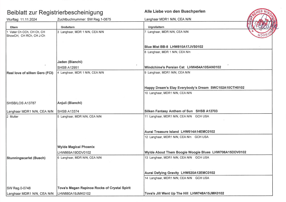 A-Lokus: ay/ay (Liebes Grundfarbe ist Rot bzw. Gelb, sie kann mit ay dominant Gelb/Rot vererben)