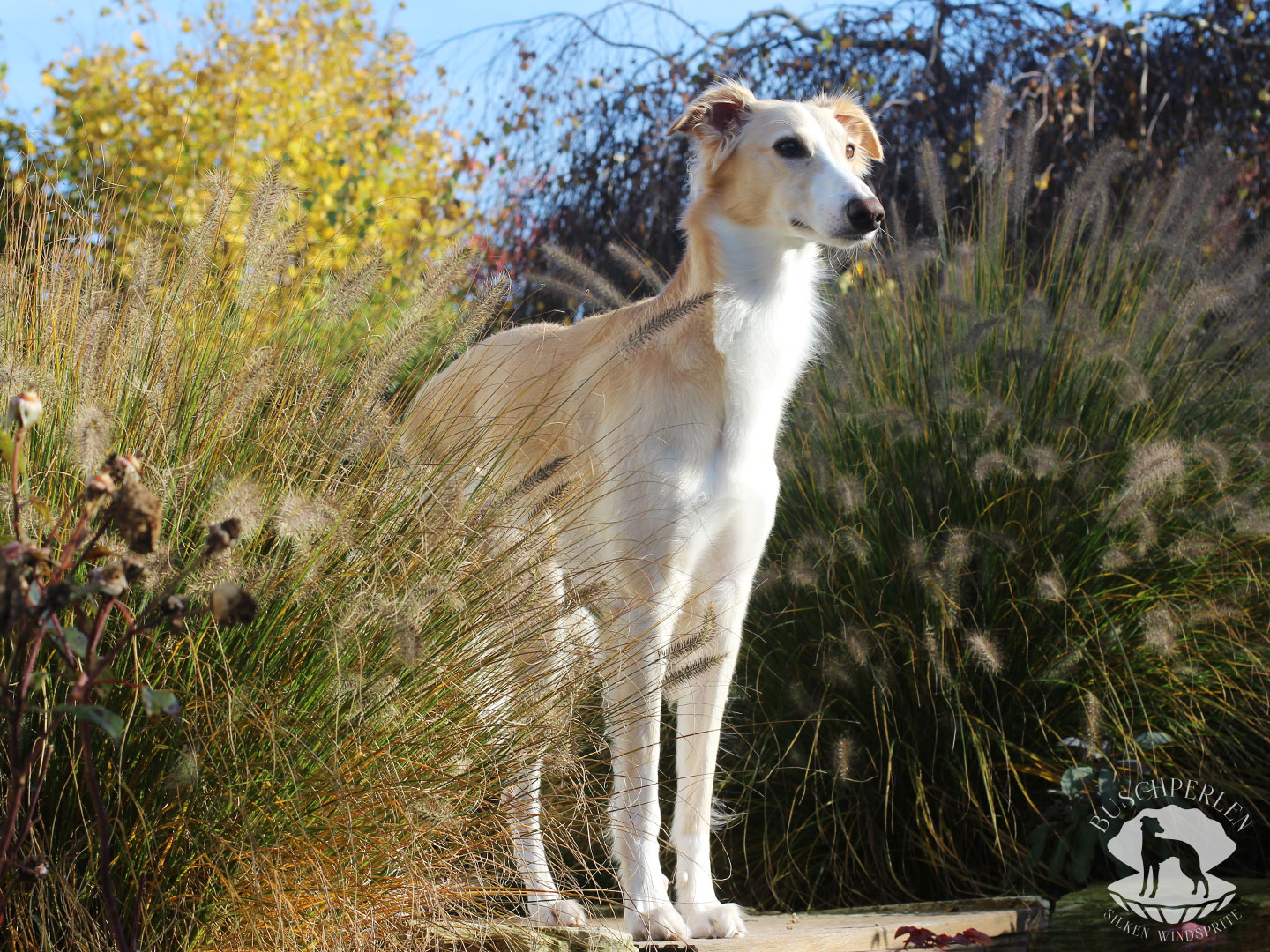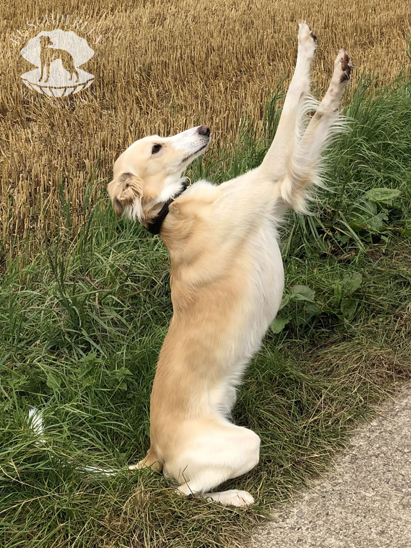 Am 15. Dezember 2019 war es soweit. Mio, unser erster Silken Windsprite zog bei uns ein. Er war von Anfang an ein aufgeweckter und fröhlicher kleiner Kerl – immer gut gelaunt und zu allen Schandtaten bereit. Daran hat sich bis heute nichts geändert. Mio ist Neuem gegenüber vollkommen unerschrocken und für einen Silken Windsprite, die doch generell eher etwas zurückhaltend sind, manchmal schon fast aufdringlich. Dass hinter seiner überschwänglichen Fassade auch ein zarter Geist steckte, konnte man schon früh erkennen. Auch heute lässt er sich von den Damen im Haus herumkommandieren und geht Konflikten möglichst aus dem Weg. Er ist ein wunderbarer Kuschler und genießt jede Form von Zuwendung. Draußen hat er enorm viel Kraft und Power und es macht so viel Freude, ihm beim Rennen zuzusehen. Wenn er seine Runden auf der Wiese oder auf einem Feld absolviert hat, kommt er freudestrahlend und regelrecht lächelnd zurück, als würde er sagen: „Das war wunderbar – das Leben ist schön!“.