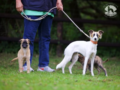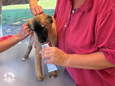 Wir unternehmen in den letzten 3 Wochen regelmäßig Ausflüge und gewöhnen die Welpen an verschiedene Umgebungen und Geräusche. Die Sozialisierung mit vielen verschiedenen Menschen ist immer noch ein regelmäßiger Bestandteil. In der achten Woche besuchen wir die Tierärtzpraxis und die Welpen werden geimpft und gechippt. Mit leckerer Bestechung finden sie das alle überhaupt nicht schlimm.
