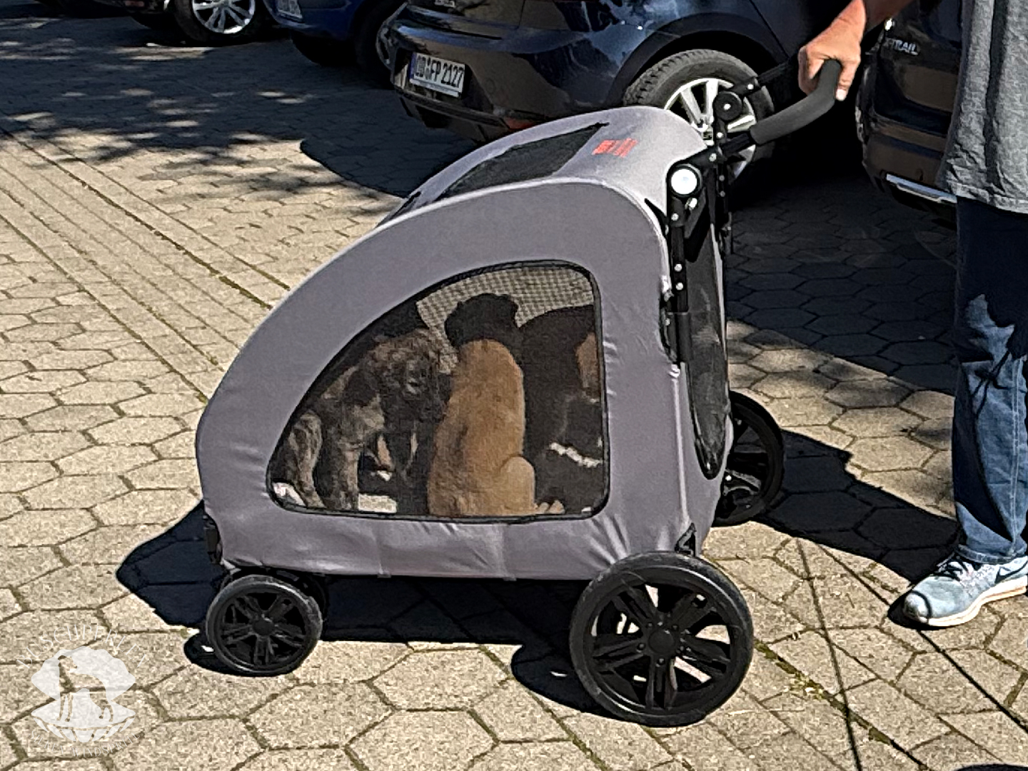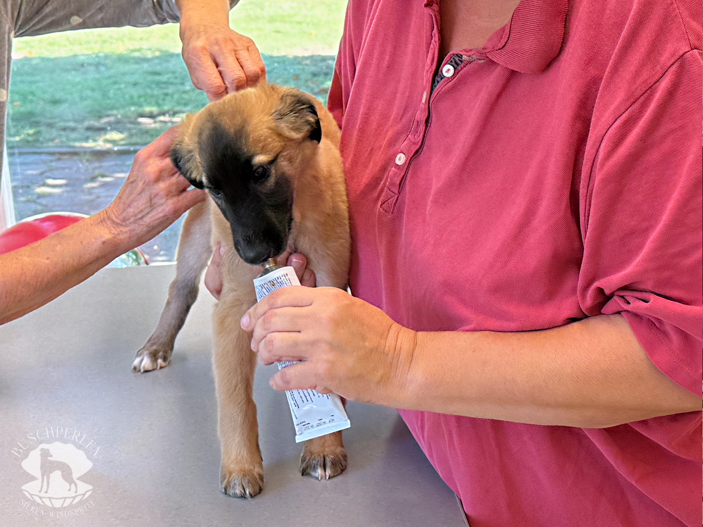Wir unternehmen in den letzten 3 Wochen regelmäßig Ausflüge und gewöhnen die Welpen an verschiedene Umgebungen und Geräusche. Die Sozialisierung mit vielen verschiedenen Menschen ist immer noch ein regelmäßiger Bestandteil. In der achten Woche besuchen wir die Tierärtzpraxis und die Welpen werden geimpft und gechippt. Mit leckerer Bestechung finden sie das alle überhaupt nicht schlimm.
